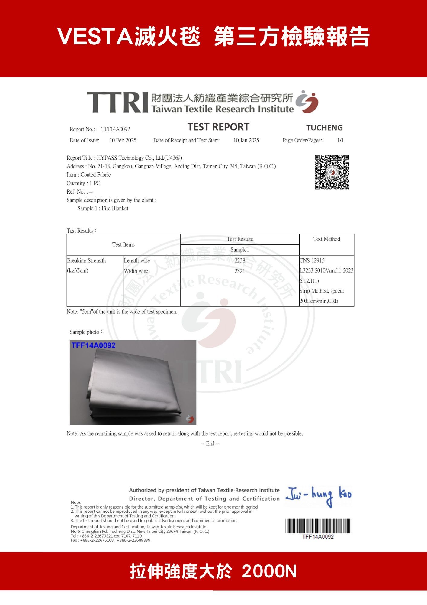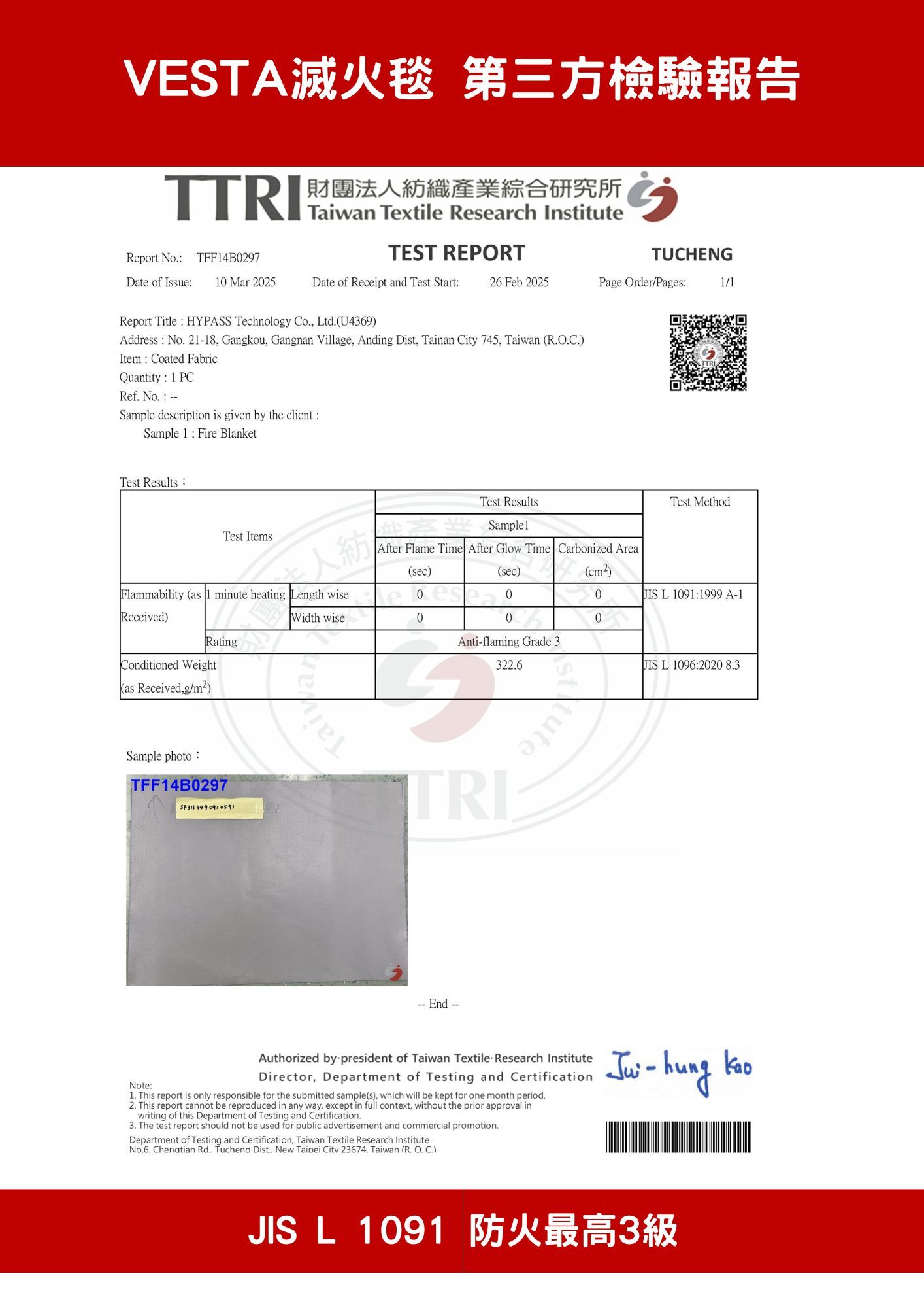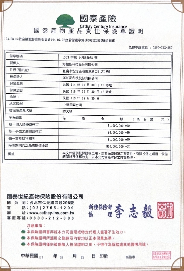 台灣CNS 7614 防焰1級