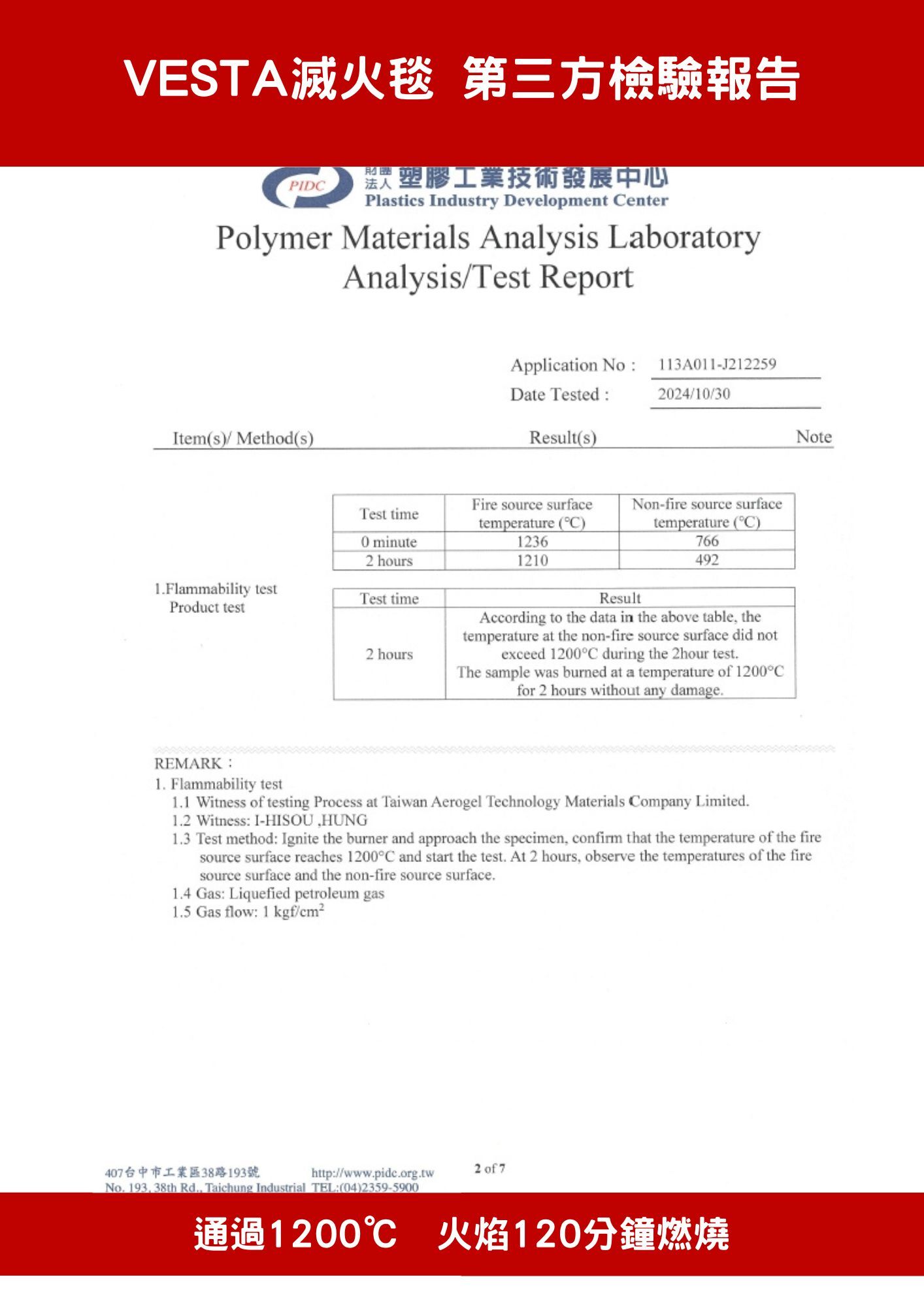 台灣耐燃燒達 1200°C 燃燒 20 分鐘